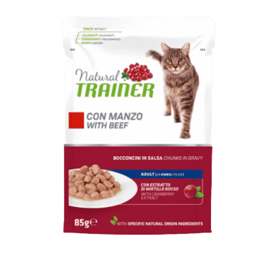 Un alimento completo ed equilibrato per gatti adulti è Natural Trainer Adult Bocconcini. Il cibo umido per gatti adulti contiene oltre al mirtillo rosso le radici di cicoria. Le fibre contenute nella cicoria sono fondamentali per la salute e il funzionamento del colon.